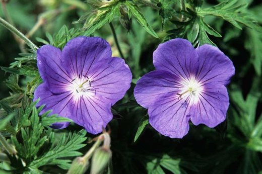 An outstanding perennial, and a big step forward from the older rather similar 'Brookside', its spreading habit ensures that it makes good ground cover and the sharply dissected leaves set off large, bowl-shaped, lavender blue flowers with overlapping petals, purple veins and a white centre. Flowering from June to August, and happy in sun and any reasonable soil that does not dry out. 60-80cm (24-36in)