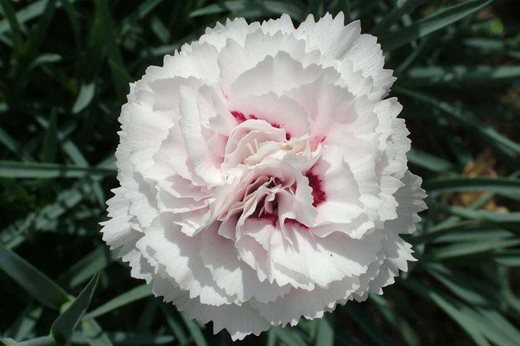 New garden pinks, with their fragrant flowers set off by slender grey foliage, are introduced every year but the 40-year-old 'Cranmere Pool' is still well worth growing. The large double flowers are white with the faintest blush and contrast with the deep blood-red zone at the heart. Flowering all summer, the flowers are scented though not strongly. 30cm (12in)