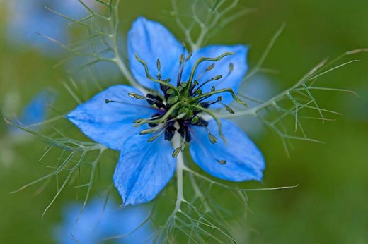 Nigella damascena 'Miss Jekyll'. Love-in-a-mist is justifiably one of the most popular of all hardy annuals, from soon after germination until the autumn seedheads, this is a lovely plant. Finely divided leaves make an attractive rosette from which spring vertical stems carrying sky blue flowers are followed by inflated seed pods. The flowers are lovely in the garden and when cut, the seed pods too, and the green pods with their purple stripes can be dried to biscuit brown. 45cm (18in). AGM