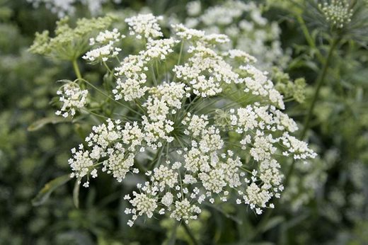 Ammi majus ‘Graceland’ - dark green, feathery foliage makes the perfect background for an unusually long-lasting display of flat, lace-like heads of dainty white flowers opening from green buds. The upright plants are ideal among perennials or other tall annuals, and are especially attractive to bees, butterflies and other insects. They also make valuable cut flowers where they bring a lightness and airiness to displays of bolder flowers in pastels or brighter shades. 1.4m (4½ft). AGM