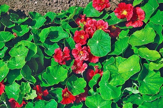 Nasturtiums, especially dwarf nasturtiums, are notorious: their flowers are so often smothered by the foliage that all you see is leaves. In most soils, plants in the Whirlybird Series not only hold their brightly coloured flowers above the leaves but the flowers look upwards showing themselves off to the best effect. There are six colours; for the best display keep the plants dryish and grow in soil that is not too rich. 30cm (12in). AGM