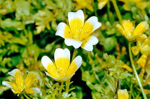 Limnanthes douglasii is a splendidly cheerful low annual, with its poached-egg flowers set against divided, fresh green leaves. It has the happy capability of enjoying conditions a little more moist than will suit many hardy annuals – even in winter. Once you have it, you’ll find self sown seedlings that germinate in the autumn will make lush mounds of leaves where other winter annuals might rot off and then they flower prolifically in spring. 15-20cm (6-8in). AGM
