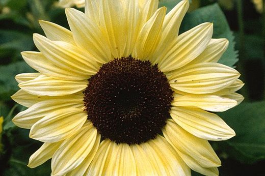 Helianthus annuus 'Valentine'. This is a sunflower with a little more style than most. Its soft, creamy white rays become a richer, deeper yellow shade close to the deep black centres and the 6in/15cm flowers are not too large, just right for the size of the plant. Like all sunflowers, ‘Valentine’ is easy to grow; just protect the young seedlings from slugs, and it lasts very well in water if you cut the stems just as the flowers are opening and use flower food. 1.5m (5ft). AGM
