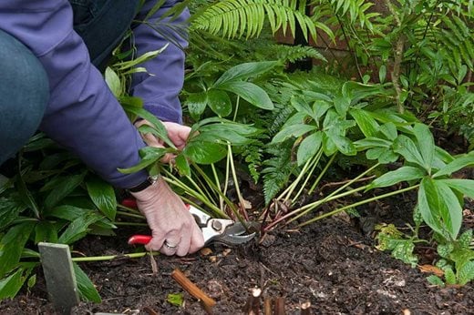 I firmly believe that one of the most useful things you can do is to cut off last year’s foliage at the end of the season as this prevents hellebore leaf spot disease being carried through the winter on the leaves and infecting the flowers. November is the best time, but it’s not too late; simply cut off the old leaves of stemless kinds such as Helleborus × hybridus right at the base.