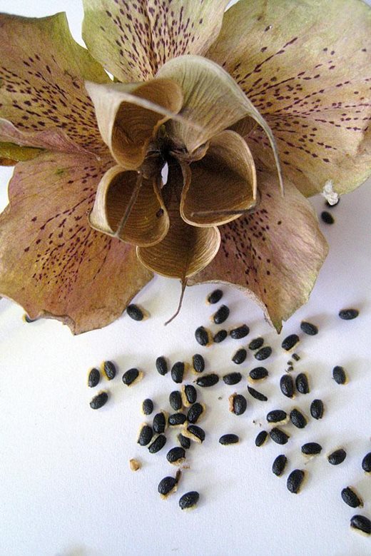 Soon after flowering comes the time when it’s important to step in and intervene to maintain the quality of your plants. Hellebores are specifically adapted to cross pollinate, so most of the seeds that fill the fat pods will be derived from two different parent plants; this means that they’re unlikely to be the same as the plant you originally chose and which carries the pods.
