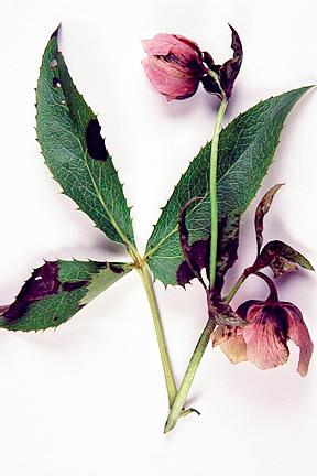 Left to right: hellebore leaf spot; seed pods shed plentiful seeds when mature; hellebore black death