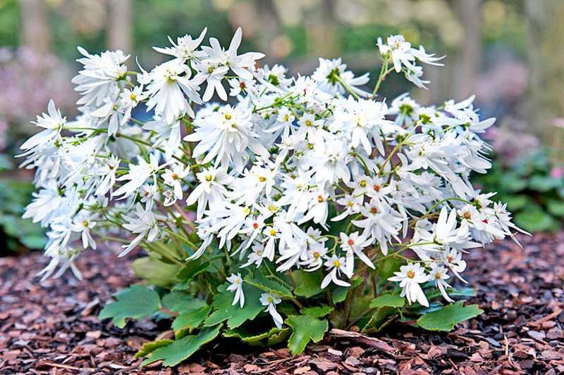 Saxifraga ‘Shiranami’ has double, clear white, starry flowers held over glossy, fresh green foliage for many weeks in autumn. Best planted in partial shade in that elusive combination of humus-rich but well drained soil. 25cm. Hardiness rating H4.