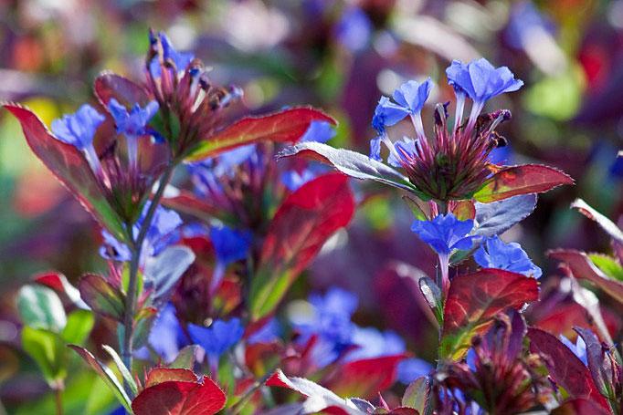 The bushy, slightly twiggy growth of the hardy plumbago, Ceratostigma plumbaginoides, brings us a rare combination of foliage and flower colours. The clusters of sharp blue flowers, a little like those of a periwinkle, open in September and October on wiry reddish stems, but the special feature of this indispensible plant is that the leaves start to turn scarlet as the flowers are at their peak. An essential front-of-the-border plant for sun. 45cm. Hardiness rating H5.