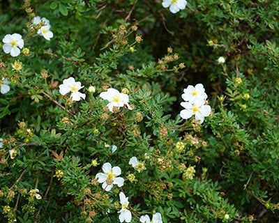 White blooms of Potentilla fruticosa ‘Abbotswood’ brighten cool borders