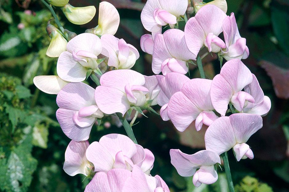 This is a little bit of a cheat. ‘Rosa Perle’ is a vigorous and extraordinarily prolific perennial relation of the sweet pea which is invaluable when mixed with the real thing. Although unscented, the soft pink flowers last far longer than those of annual sweet peas and come with up to fifteen flowers per stem. 2m (6ft 6in). H7.