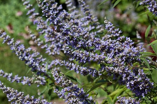 Vitex agnus-castus var. latifolia has dark, neatly pointed, aromatic foliage. It needs a sunny wall to flower well but given that and any reasonable well-drained soil is usually covered with a profusion of 15cm spikes of fragrant, lilac-blue flowers in September and October. Best pruned back to a framework each spring 3m (10ft). Hardiness rating H5.