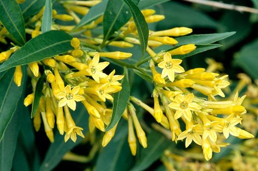 deciduous shrub develops its power in the evening and at night, so Cestrum parqui is best planted near where you sit out on a summer or autumn evenings. The clusters of tubular yellow flowers are followed by purple berries. Best on a sunny wall, but may still be cut back in winter although it re-grows from the base. Height to 2m (6.5ft). Hardiness rating H3.