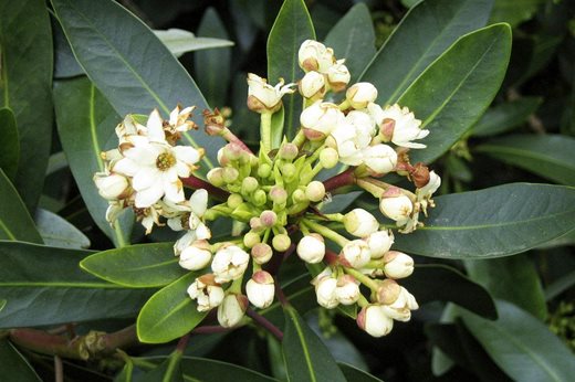 Dark, leathery, rhododendron-like foliage shows off the clusters of creamy, well-scented flowers which open in loose clusters in the shoot tips in spring and early summer. Drimys winteri will outgrow its space when happy, but fierce winters may cut it back. Prune thoughtfully after flowering, especially if frosted, cutting back to new shoots. Height to 4m (13ft). Hardiness rating H4.