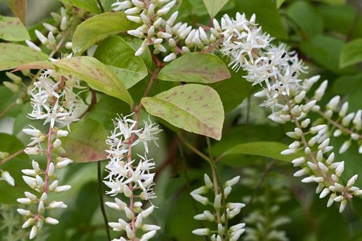A deciduous shrub with attractive rich red and purple autumn colour and fragrant creamy-white flowers in July