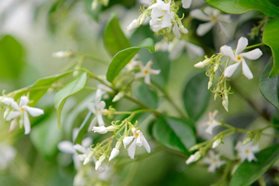 This twining evergreen, Trachelospermum jasminoides, features clusters of heavily scented white flowers, fading to cream, and set against dark glossy foliage which develops bronze tints in winter. Once grown in conservatories but now proven hardier than was thought and so becoming popular. Easily pruned in early spring to keep to the size needed. The