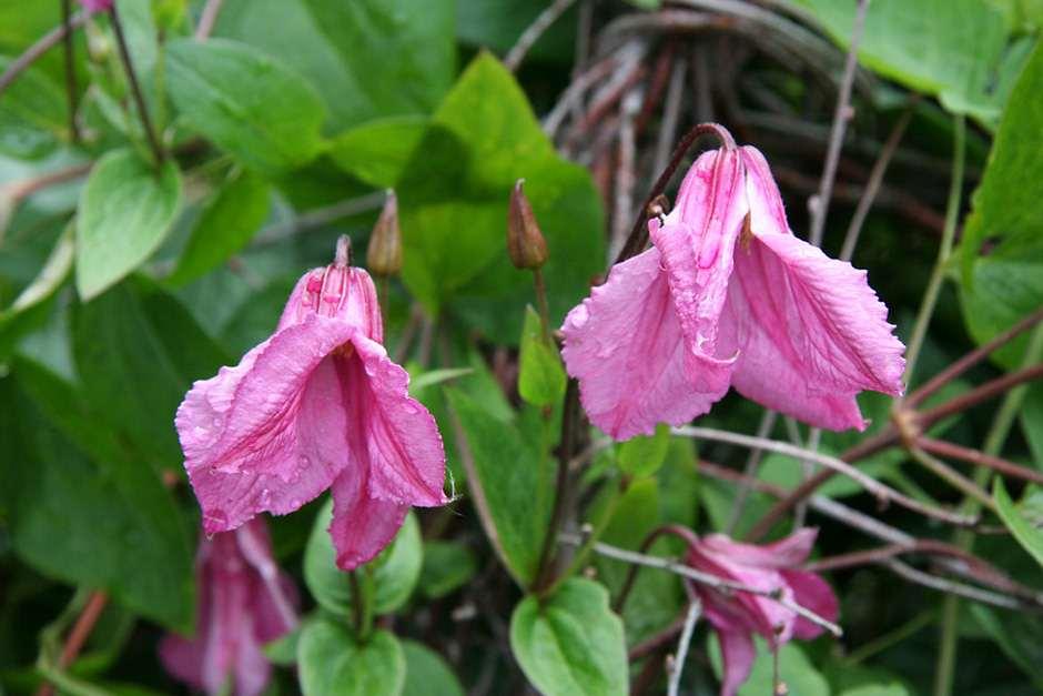 The large ruffled bells of this prolific yet very manageable clematis are bright pink, sometimes with mauve tints, and with a darker stripe through each petal. Opening from June, their season sometimes extends even into October and the flowers are followed by fluffy seed heads in pale gold. Does not cling, so needs a little help to make the best of its support. Prune hard in spring. Best in sun. 2m (6ft).