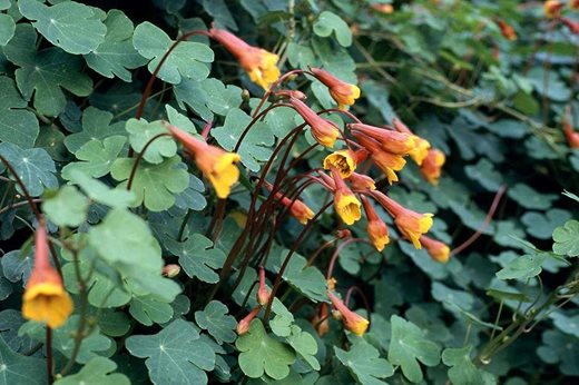 This perennial relative of the nasturtium features neat, lobed leaves showing off a long season of orange-yellow flowers, each with a reddish spur; blooming usually starts in July, continuing until the frost. This is a far more refined, and better-behaved, plant than the familiar climbing nasturtium. Best in rich soil, in sun. 1.8m (2ft).