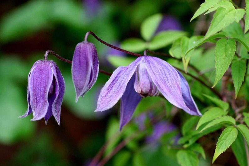 The flowers of Clematis macropetala ‘Lagoon’ bloom in spring and early summer
