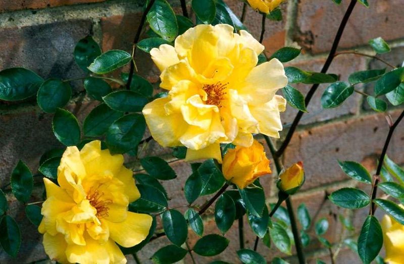 This most famous of English Roses, Graham Thomas (‘Ausmas’), is named for the great rosarian and recommended by its raiser as a climber rather than for growing as a shrub; its growth is more lax than that of other English Roses. The pure rich colouring of the cupped flowers, coupled with their powerful tea rose scent and their long season, is always captivating. 2-3m