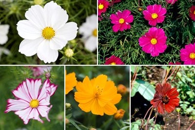 Annuals have feathery leaves and saucer-like, white, pink, red, orange or yellow flowers. In some, the petals fuse to form an open cup. Cosmos atrosanguineus has dark red, chocolate-scented flowers.