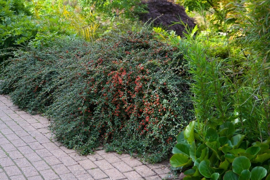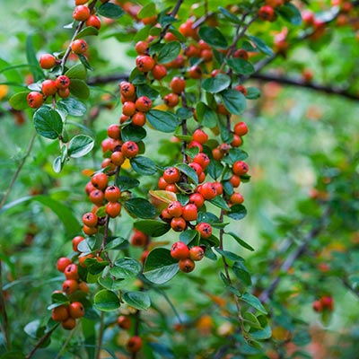 In spring and early summer, small pink-white flowers cover the branches. These are followed by clusters of red-orange or yellow berries in autumn/winter. Plants are mainly evergreen, with some deciduous cultivars that blaze with fiery autumn colour.