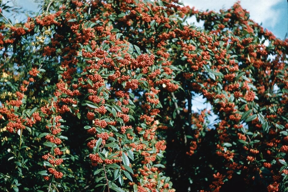 Initially upright, these vigorous shrubs often have arching stems and can be tree-like in outline once mature. Creamy-white late spring flowers are usually followed by red-orange or yellow berries.