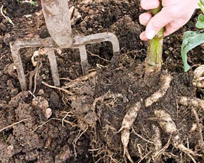 When the shoots are about 2.5cm (1in) tall, lift the clump of tubers and divide it into several pieces, making sure each has both roots and shoots