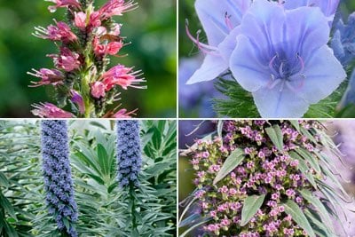 Echium typically have bristly, lance-shaped leaves. The height of the flower spikes can vary from 50cm (20in) with species like the British native viper’s bugloss (E. vulgare), up to 4m (13ft) for the impressive E. pininana.
