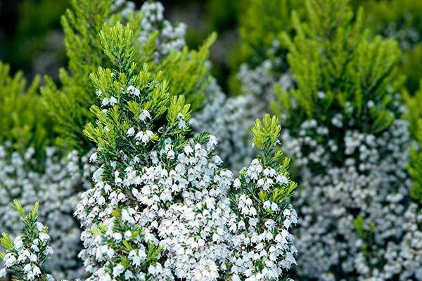 Tiny bell-shaped or tubular flowers, in shades of pink, purple, red or white, smother these usually compact shrubs at various times of year, depending on the cultivar. The fine, needle-like, evergreen foliage provides yet more colour, in various shades of green or yellow, often tinged with copper.