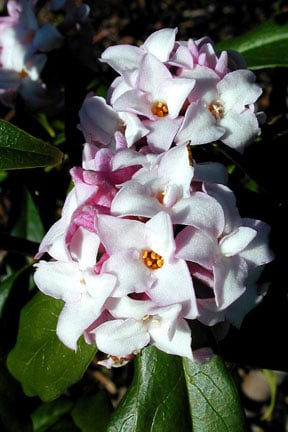 Daphne bholua * white, flushed purple-pink flowers; height 2-4m (6½-12ft), spread 1.5m (5ft)