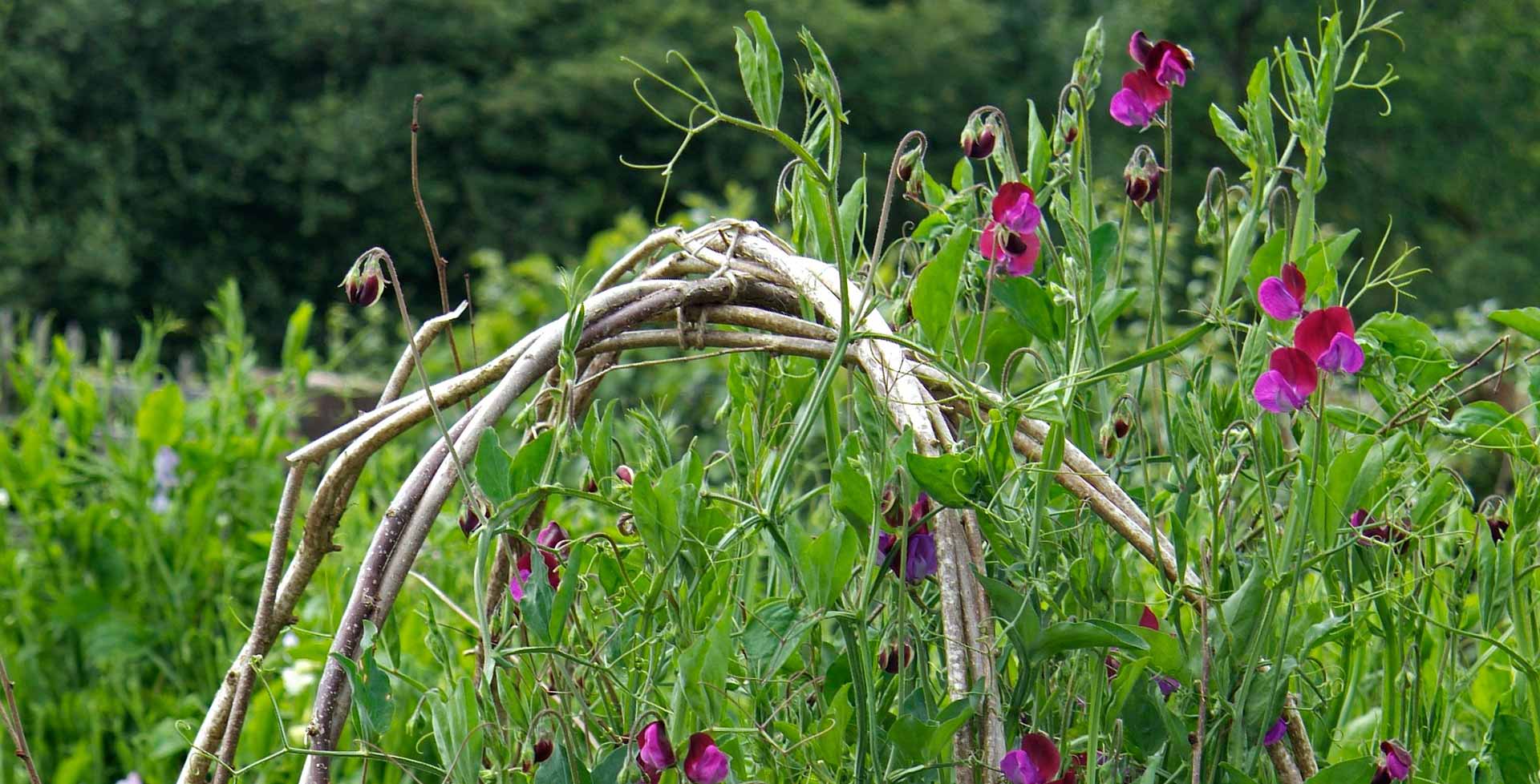 When growing sweet peas for the vase or show bench, tendrils are pinched out and the single plant stem (cordon) tied to a cane or similar support. This concentrates the plant’s energies and makes for bigger flowers on long stalks.