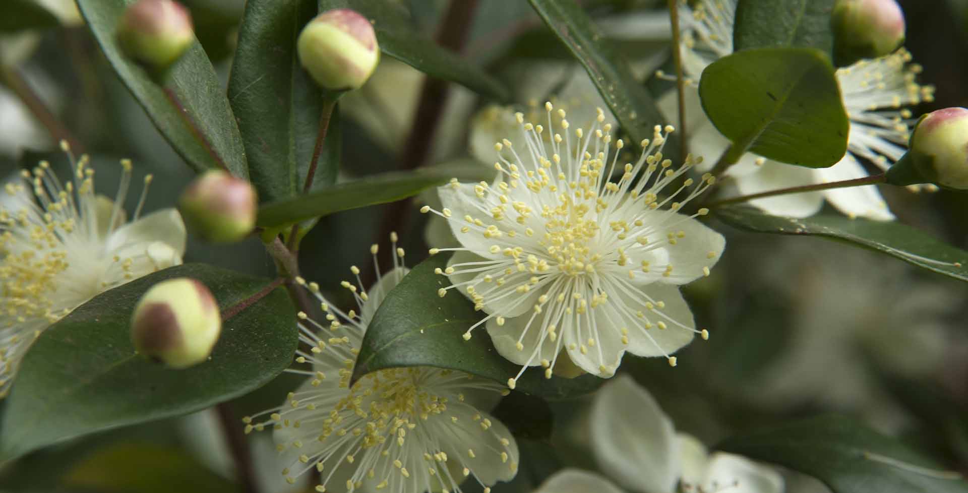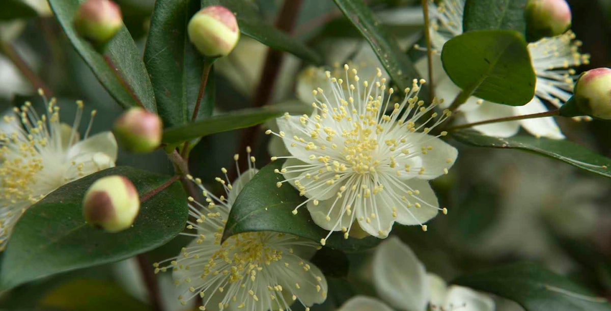 Myrtle forms a dense, bushy shrub with small, glossy, deep green leaves that release a pleasant fragrance when crushed. In mid- to late summer, it produces frothy white flowers with a huge number of stamens, followed by bluish-black or white berries.