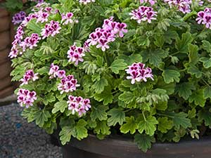Pelargonium are plants that evoke a holiday in the sun, with their rounded clusters of vivid red or orange flowers and bushy leaves, often strongly marked with purple or red. Trailing types have green ivy-shaped leaves and others are wavy-margined. Some even have scented leaves. Flowers also may vary from pure white through to pinks, mauves and deep purples, sometimes with a contrasting dark blotch.