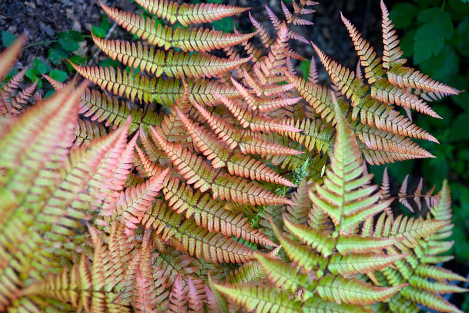 Surprisingly perhaps, they’re not all just green. D. lepidopoda (sunset fern), another semi-evergreen, has new fronds that emerge as orange to pink before turning a deep green. The central stem (rachis) of the fronds of D. cycadina AGM (shaggy shield fern) is nearly black in appearance, with thick, dark scales which make its bright green frond colour seem to glow and in turn illuminates a shady spot. In autumn, many ferns change colours too, with D. filix mas turning lovely yellow hues to enrich a woodland display.