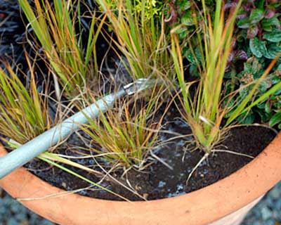 These need much more water than plants growing in the ground. Water as often as needed, which could be daily in hot weather. Try not to let the compost dry out, but don’t let it get waterlogged either.