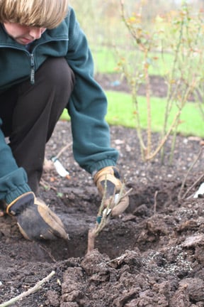 - Place the rose in the centre of the hole and, using a small to identify the top of the planting hole, ensure the graft union (i.e. where the joins the rootstock and the point from which the branches originate) is at soil level (not below as this is reported to increase the risk of rose dieback).