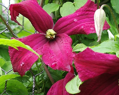 A very distinctive clematis, known for the unusually bright red colouring of its flowers with purplish overtones, and the twist that develops in the petals as they mature, Clematis ‘Madame Julia Correvon’ dates back to 1900 and is a long-time favourite. It is ideal for training into mature shrubs and for which the simple pruning is a hard cut back in spring. Height 2.5-3m (8-10ft). Hardiness rating H6.