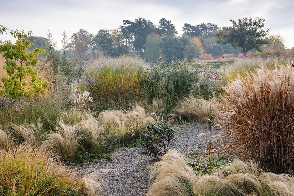 The foliage and seedheads of deciduous grasses turn straw-coloured in autumn, but should be left in place over winter to provide structure and movement. They look particularly spectacular laced with frost.