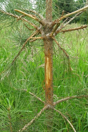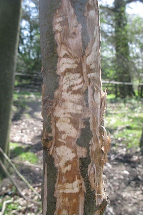 - Gnawing of bark by mammals including voles, rabbits, deer and horses around the base of newly planted trees or in very cold weather when food is scarce. Access to bark above tree guards can occur when snowfall is deep.