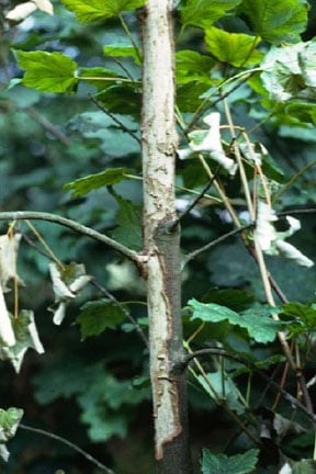 Deliberate ring-barking: Ring-barking is sometimes used as a technique for killing off unwanted vegetation. However, it is not a recommended practise in most horticultural circumstances as this may provide a source for honey fungus infection and is unsightly. Partial ring-barking or ‘ringing’ is also used in fruit production to reduce shoot vigour and promote fruitfulness but again is not advised for home gardeners as it can, if not done properly, lead to the loss of the tree.