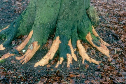 Main causes/caused by - Careless use of machinery close to trees and animals such as grey squirrels, horses, deer, hares, rabbits and voles gnawing on the bark