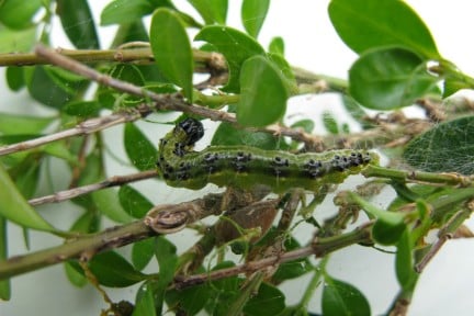 The caterpillars of this moth can completely defoliate plants. First found damaging plants in gardens in 2011, the moth has since become more widespread and is a significant defoliator of box plants throughout much of South East England and beyond. It is now considered a common resident. For more information and to submit reports of this insect visit the box tree caterpillar profile on the link above.
