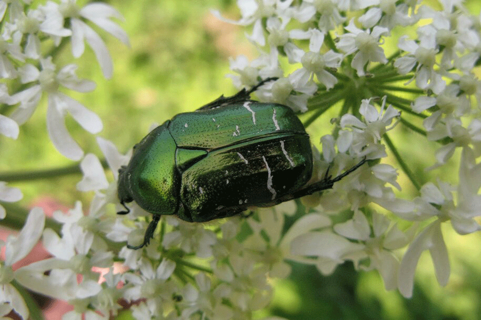 Though its name may suggest a less-than-helpful garden visitor, the eye-catching rose chafer beetle (Cetonia aurata) should be welcomed. This bright metallic green beetle often appears from May, and its larvae feed on dead and decaying matter, assisting with composting in the garden.