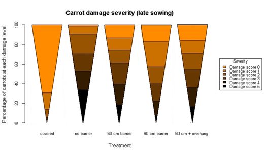 RHS research has compared different heights of barriers and complete covering with netting as methods of control of carrot root fly. The results have been interpreted and have informed the advice given on carrot fly and growing and protecting carrots.