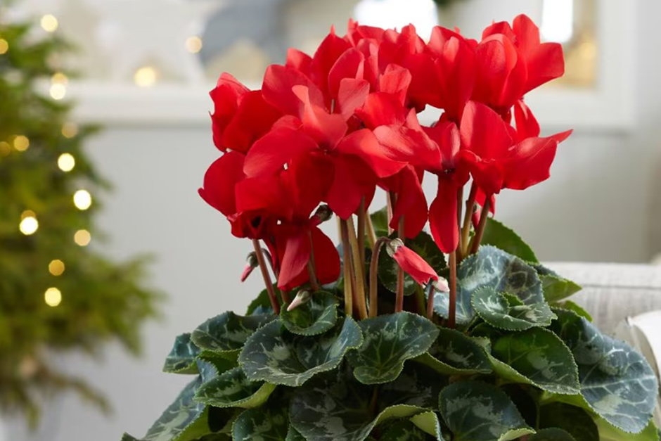 A festive favourite with brilliant scarlet blooms that brighten winter windowsills. This compact cyclamen produces fl owers over a long seasonu001d, contrasting beautifully with its marbled foliage