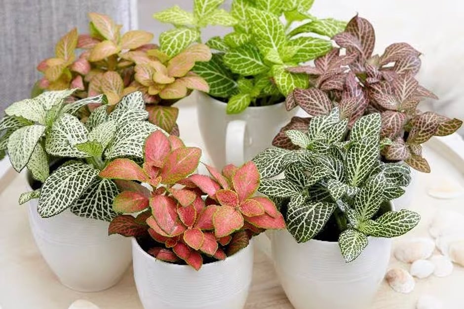 This multiu0018coloured collection of snakeskin-leaved creeping plants will love the humid conditions inside a large bottle garden.