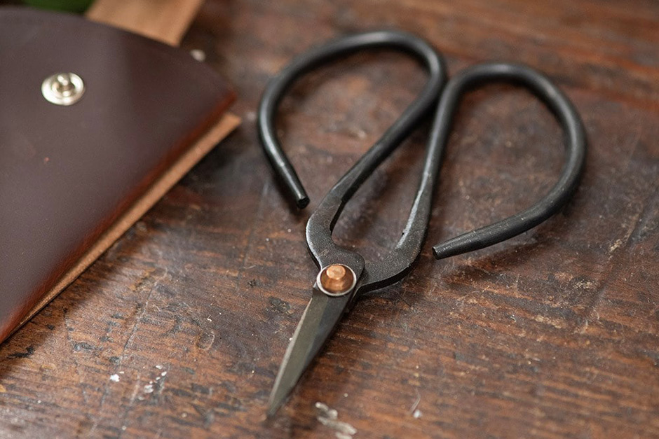 A compact pair of snips for light cutting, supplied in a leather pouch for safekeeping.