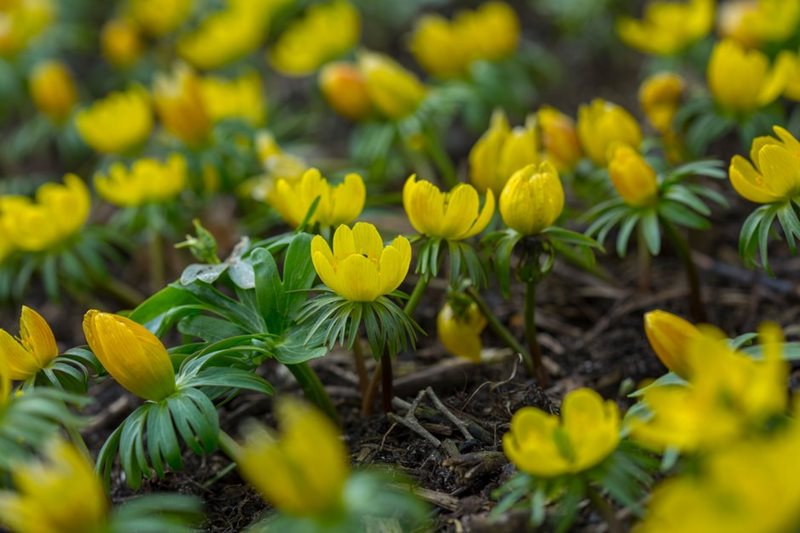 A must for any garden as the buttercup yellow blooms of Eranthis hyemalis are often the first to flower during the depths of winter. Expect to see carpets of bright yellow flowers in late January and February surrounded by ruffs of fresh green leaves.