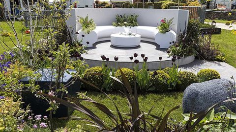 The circular seating area represents the concentric rings of a telescope with granite setts depicting the solar panels on a spaceship. The black and white planting scheme signifies The Berrow’s Journal newspaper.