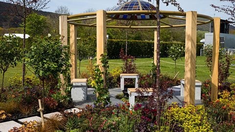 The garden invites the visitor to take the journey to the centre and pause for a moment to enjoy the space within. All the while they are enveloped by the warmth of the colour-themed planting below and bathed in the coloured light beaming down from the stained glass dome above.